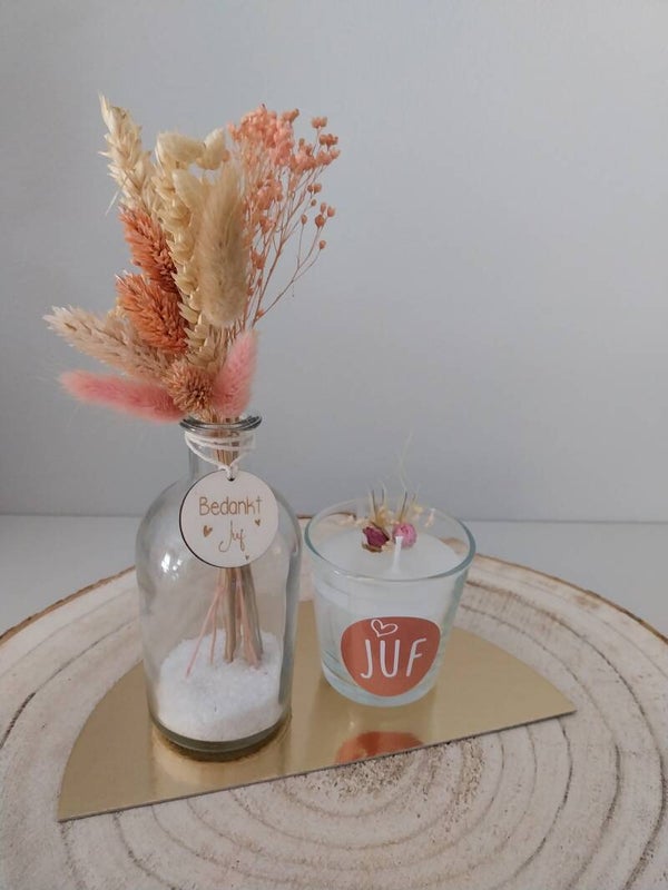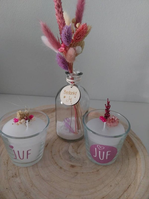Kaars met droogbloemetjes en Juf: €6,5